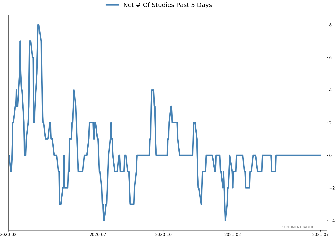 Last week, the smallest of options traders bought $4.3 billion worth of put options and $4.5 billion worth of call options. So, their spending on hedges was 96% of their spending on speculation, one of the highest ratios in 22 years. The Backtest Engine shows only modestly positive medium-term returns but excellent long-term ones. That's because this kind of behavior only occurred during the depths of the worst declines of the past two decades.