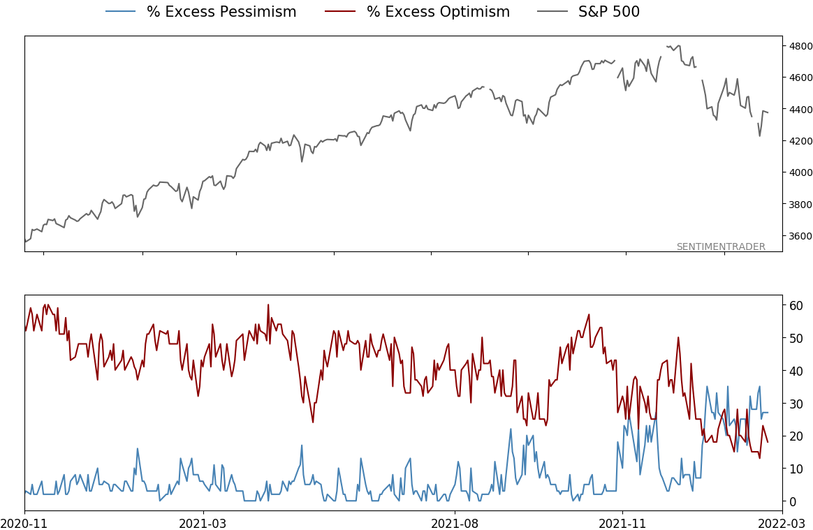 Last week, they spent 29% of their volume on buying put options to open, among the highest levels in 22 years. They still spent 37% of their volume on buying call options to open, a high amount historically but the lowest since April 2020.